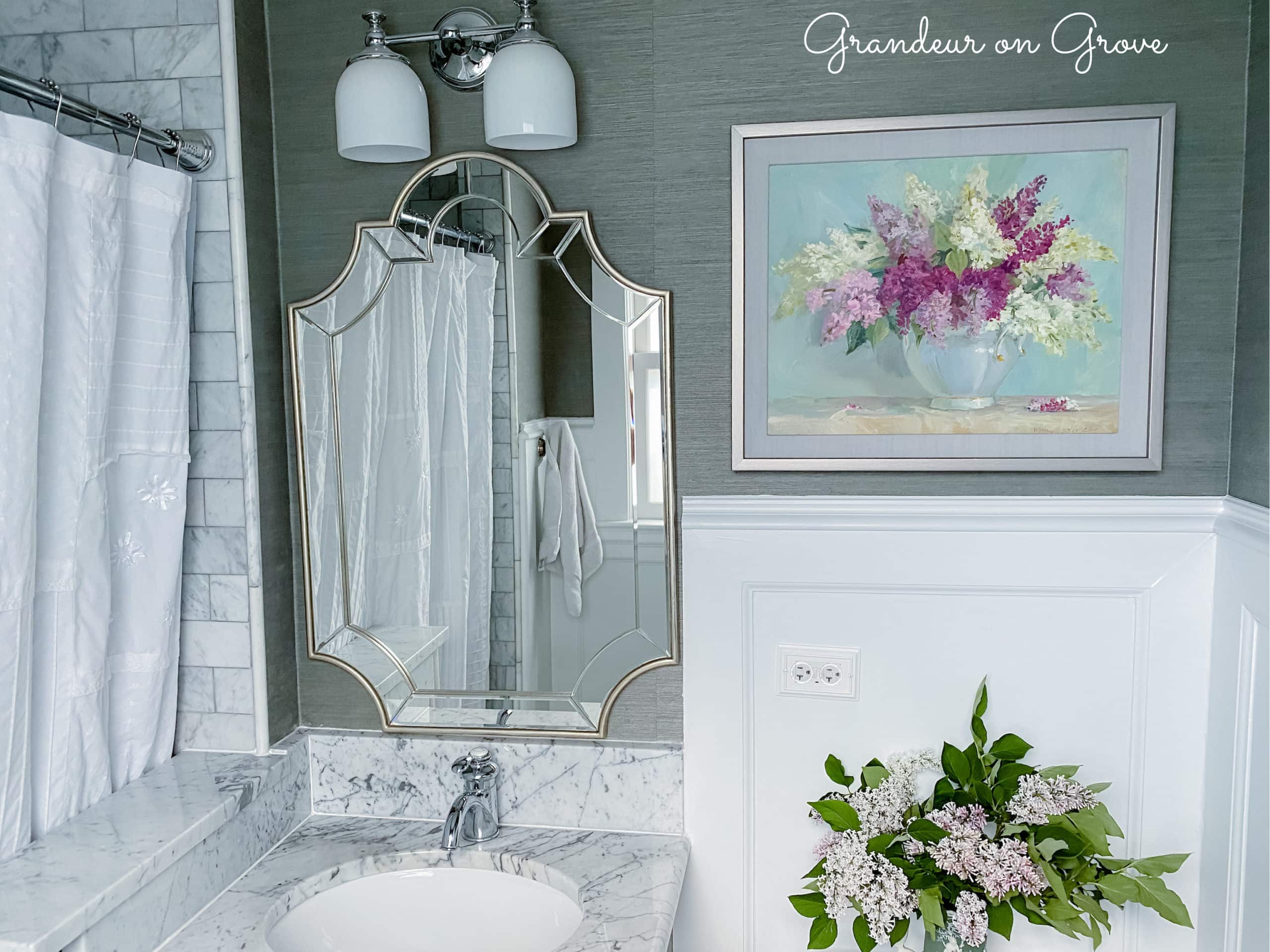 When developing a room’s decorative scheme, I am usually inspired by a rug, painting, or fabric. This time, I fell in love with a bathroom on Pinterest and decided to install similar sage green grasscloth wallpaper in a bathroom makeover. Check