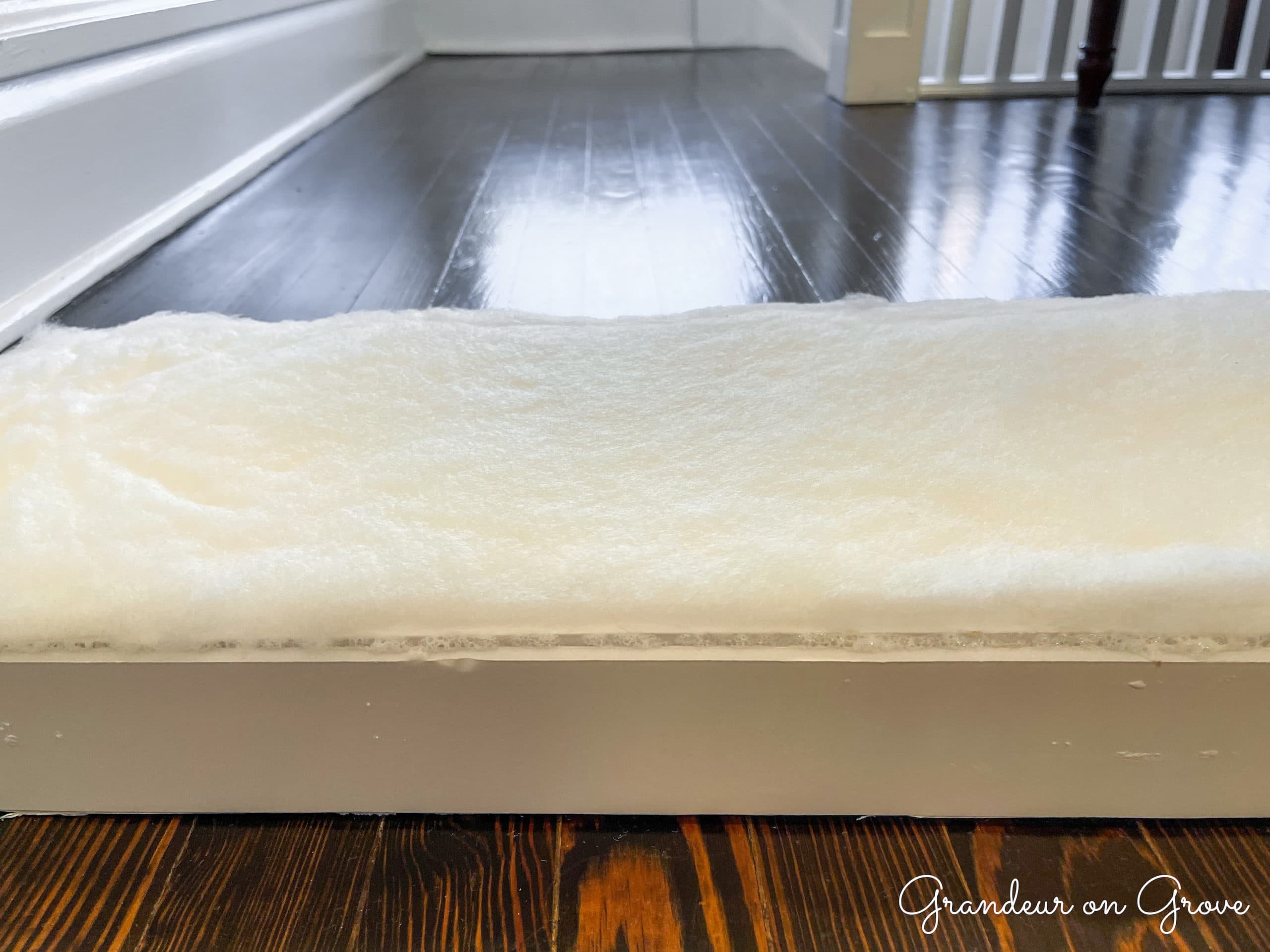 7. With a polyester batting roll, cut a piece to fit the front panel. You could also curve the batting around the sides and top if want your cornice to be extra poufy. Use Gorilla Glue to attach batting to the board. Let it dry completely.