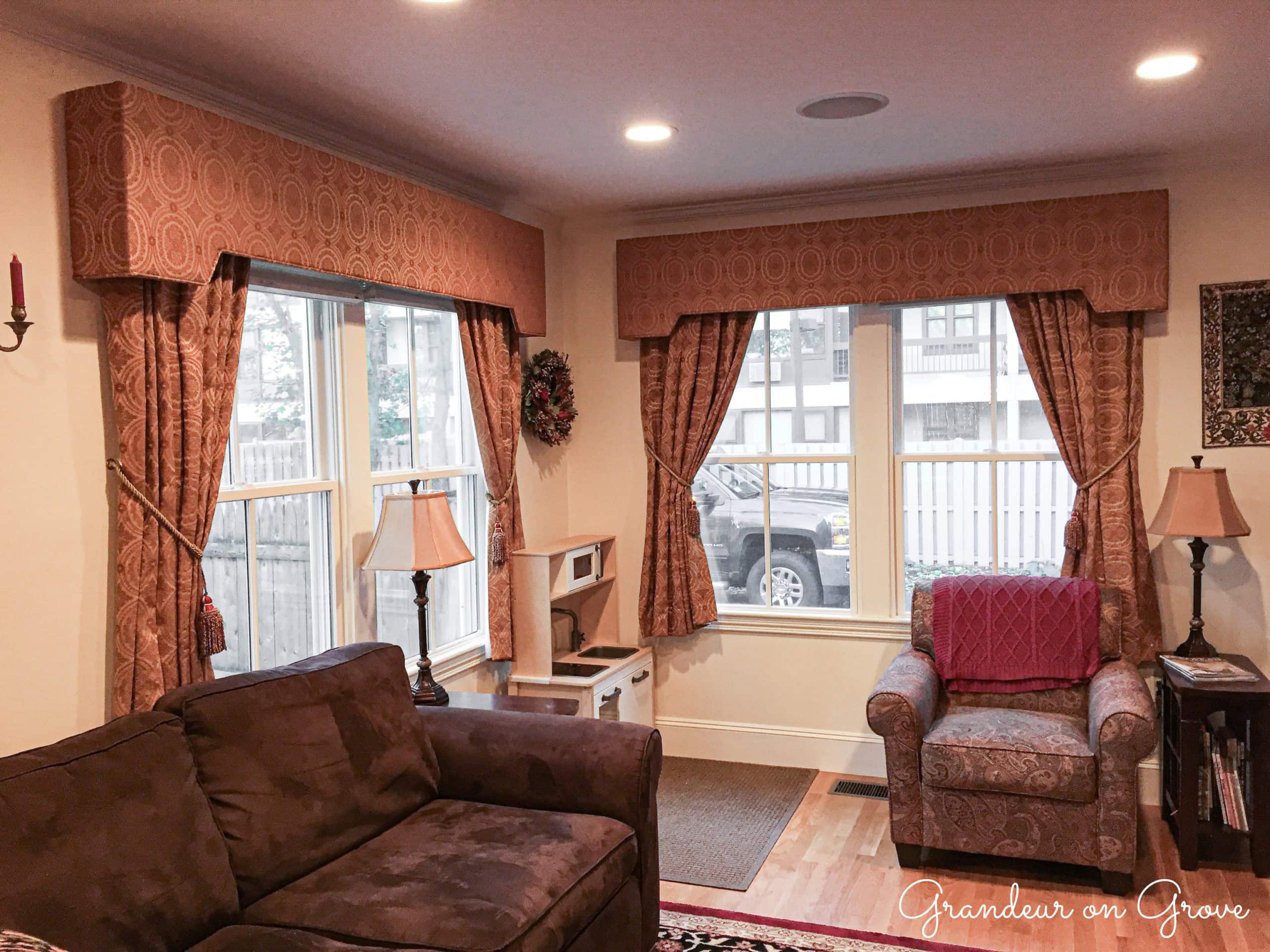 Our formal living room has two square windows, one on each side of the fireplace bump-out. They are very old hopper windows that open inward from a bottom hinge, but they are painted shut and currently inoperable. Because that room is a little dark and the windows are high enough to not have privacy concerns, I opted not to cover the windows. I wanted to allow maximum light in to the room. My husband, however, lamented the reflection they caused on our TV in the next room. He requested window treatments to solve his reflection issue.