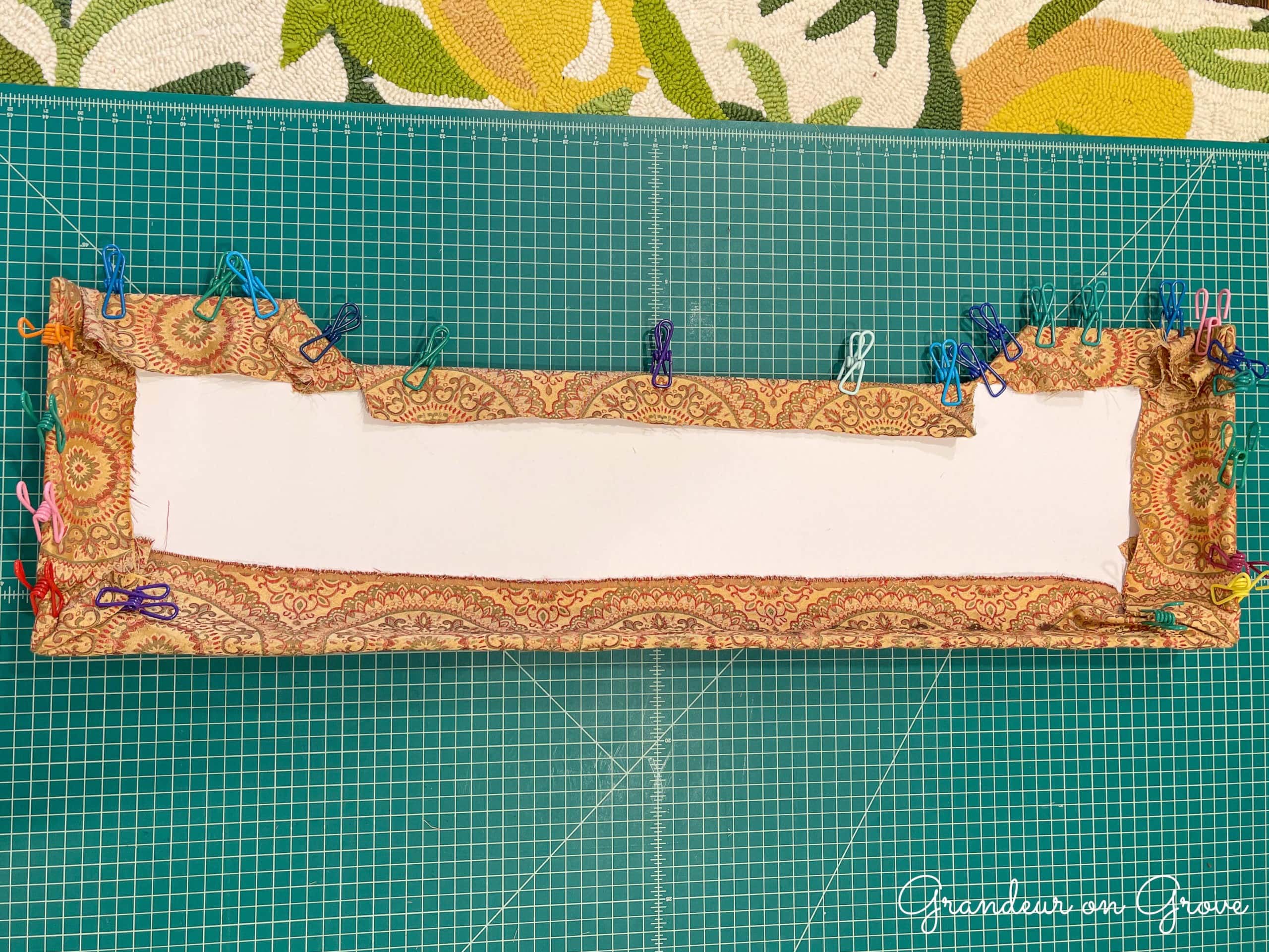 10. Turn it all over to work on the backside. Start pulling the fabric tightly around to the backside and hold it in place with clips. Cut small notches if you have a decorative pattern on the bottom that requires a curve in the fabric.