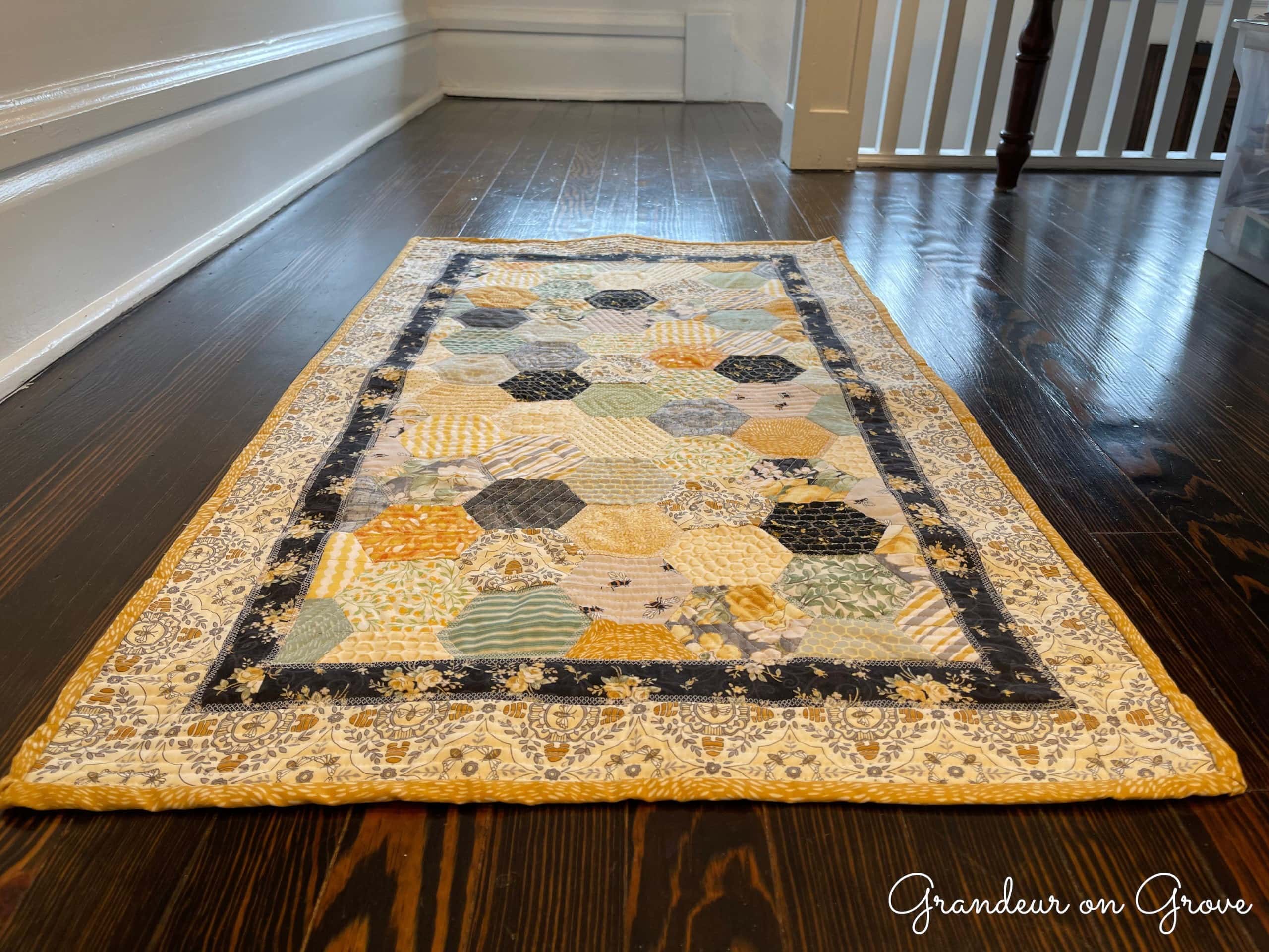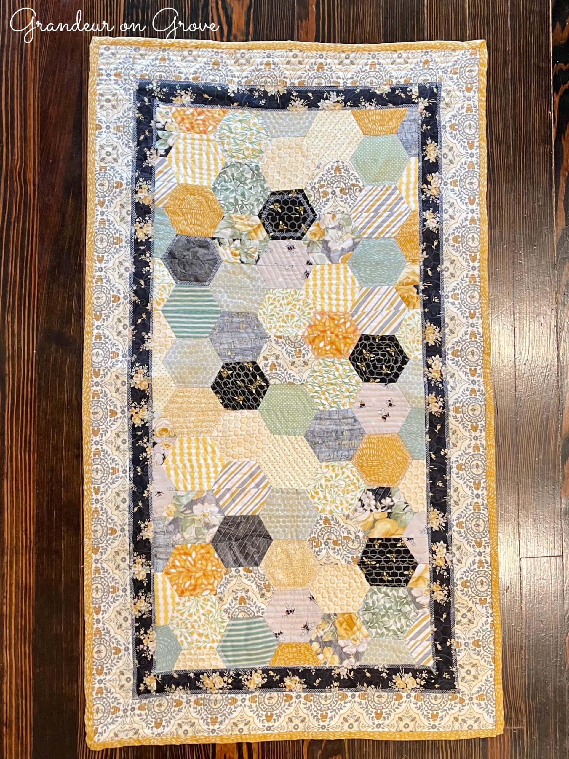Lastly, I added a yellow and grey floral backing–you know, to help the bees make the honey ;)–and yellow binding to finish the wall hanging.