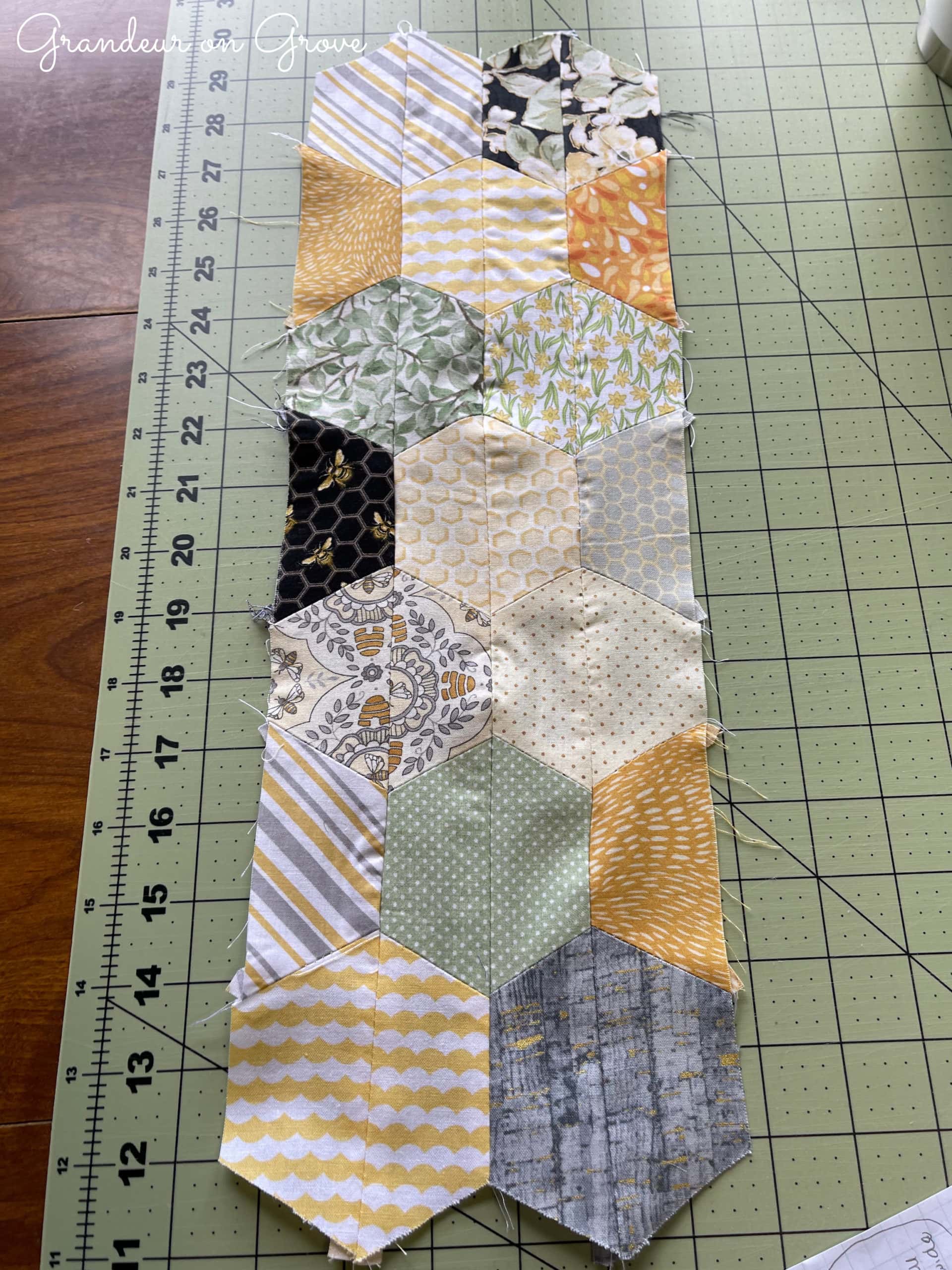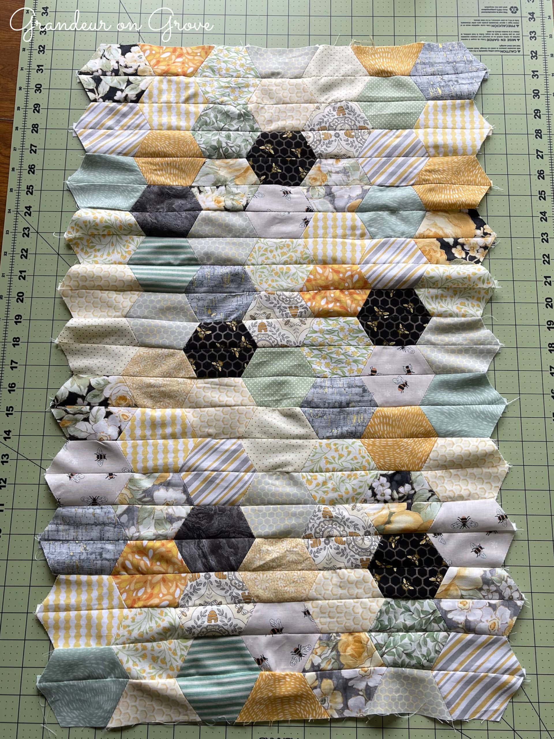 At this year’s quilting retreat, I decided to use a half-hexagon cutting template to create a wall hanging. I’d had an assortment of bee-themed fabrics and some lovely yellow and grey prints. A bee theme seemed appropriate for a hexagon honeycomb pattern. For this article, I’m sharing an overview of the process from designing the pattern to finishing the quilt, but this is not a step-by-step how-to.
