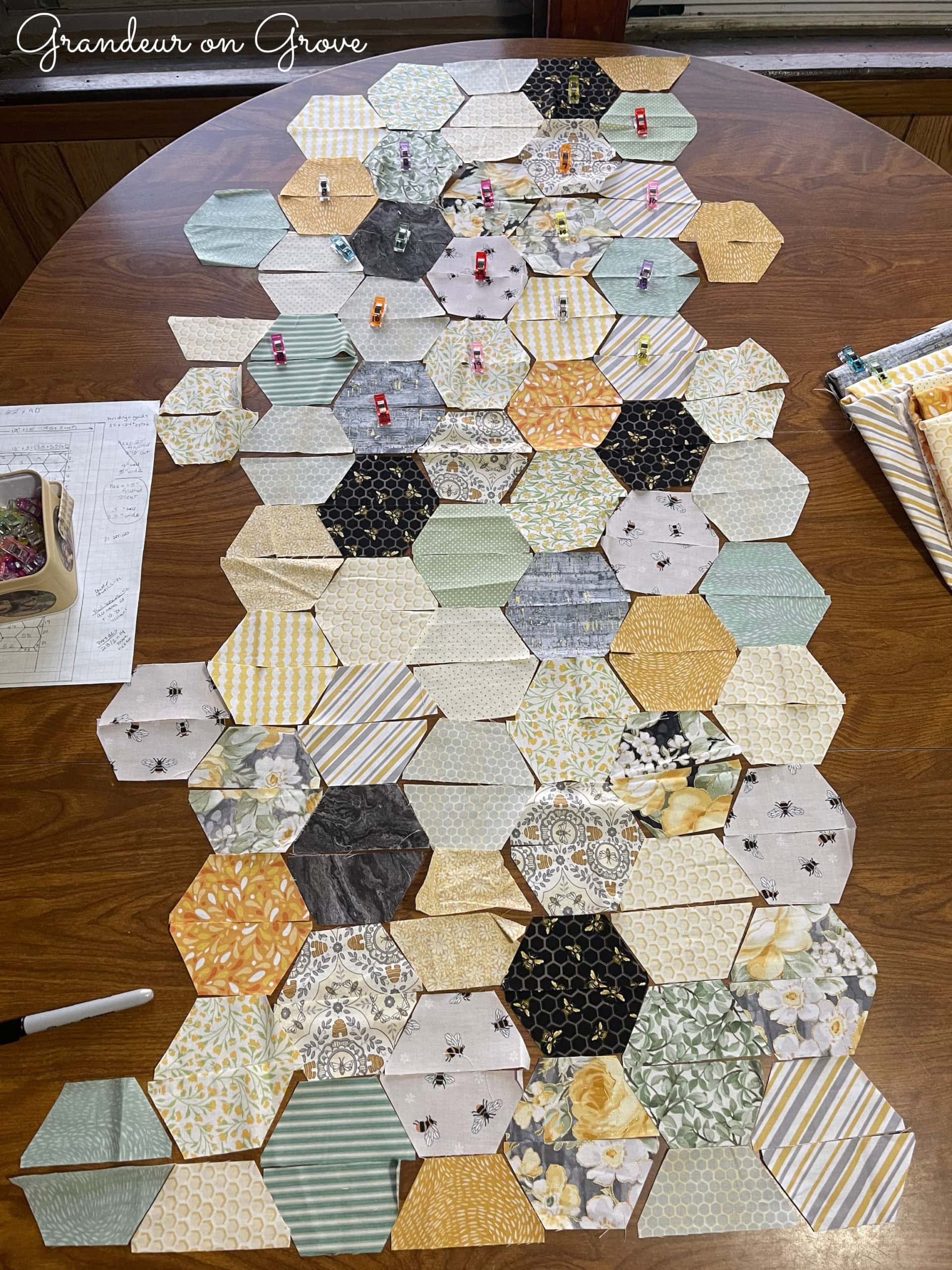 Above, you can see a few rows sewn together. It is crucial to have the seams line up to make a clean hexagon shape when sewing one row to another, like in all quilting. Once I sewed all the hexagons together, I had what you see in the picture below.