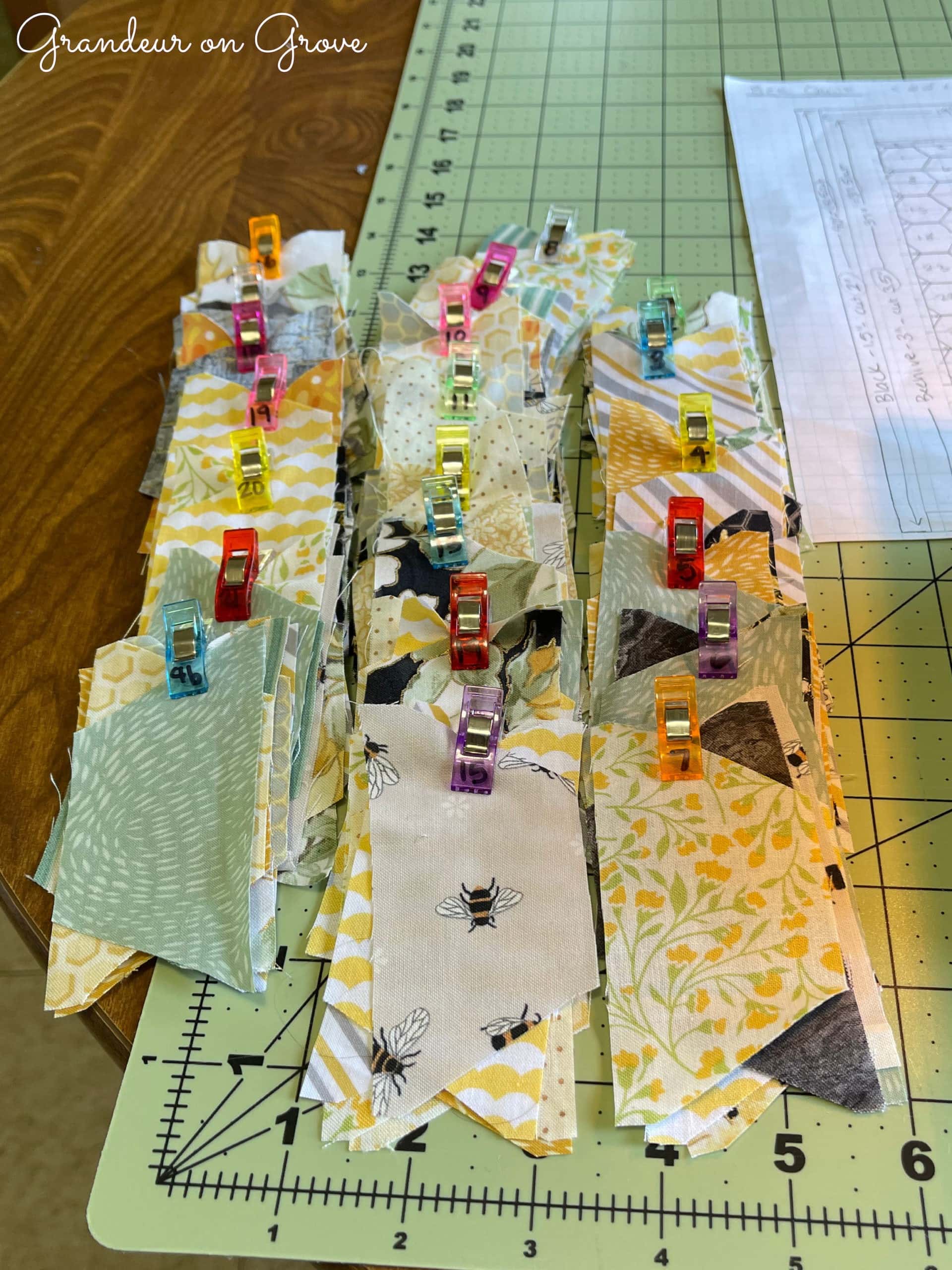 Next, having cut out the half-hexagon pieces, I arranged them on the table to determine the layout of the different fabrics. Because the hexagon pieces are halved, you sew the halves together as strips before connecting them as full hexagons. To do this, I stacked the pieces and clipped them together in numbered rows to keep track of their position, as seen below.
