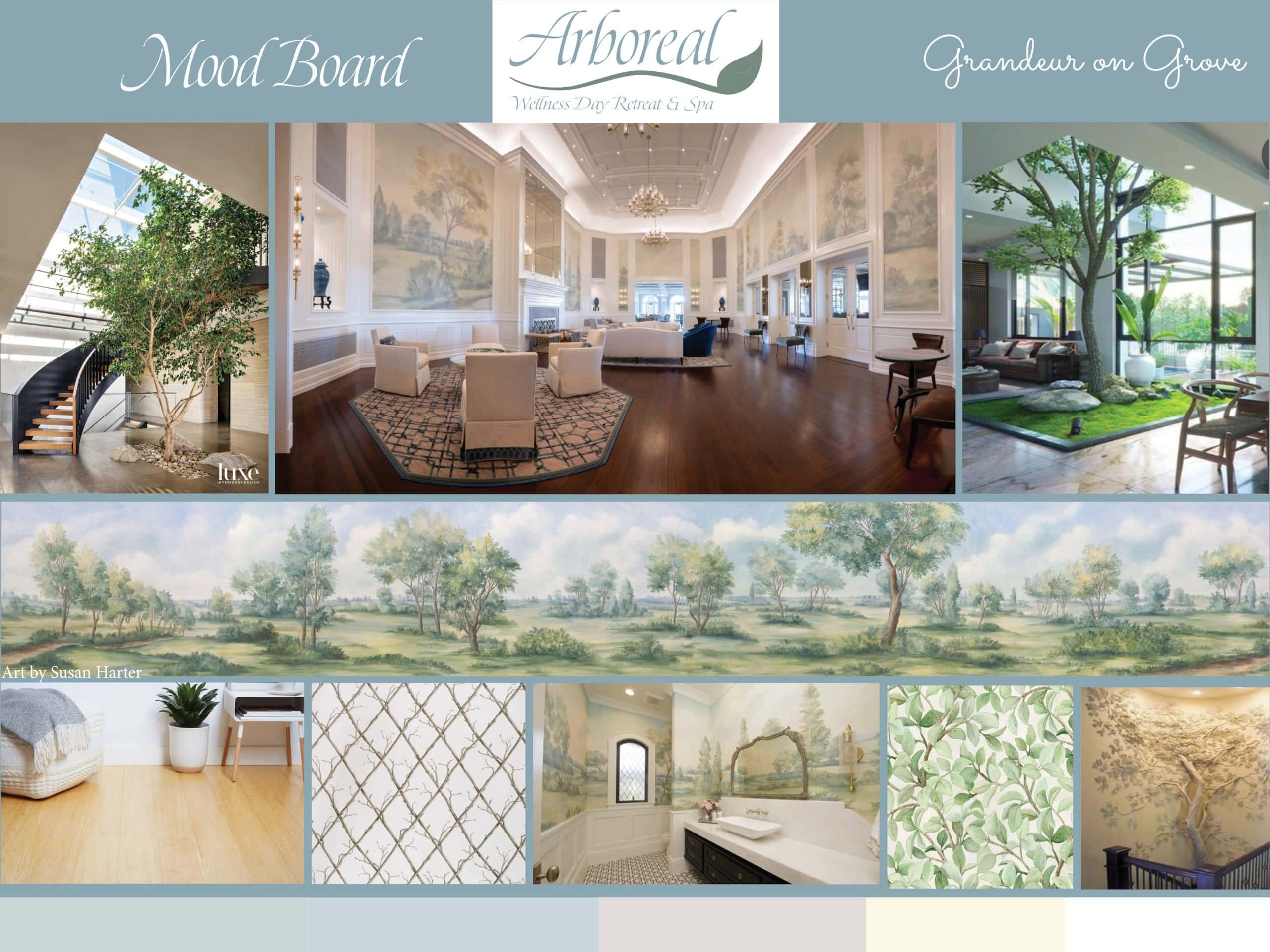 A mood board designed in a traditional style for Arboreal, a wellness day retreat and spa, in the Berkshire Mountains of Massachusetts: