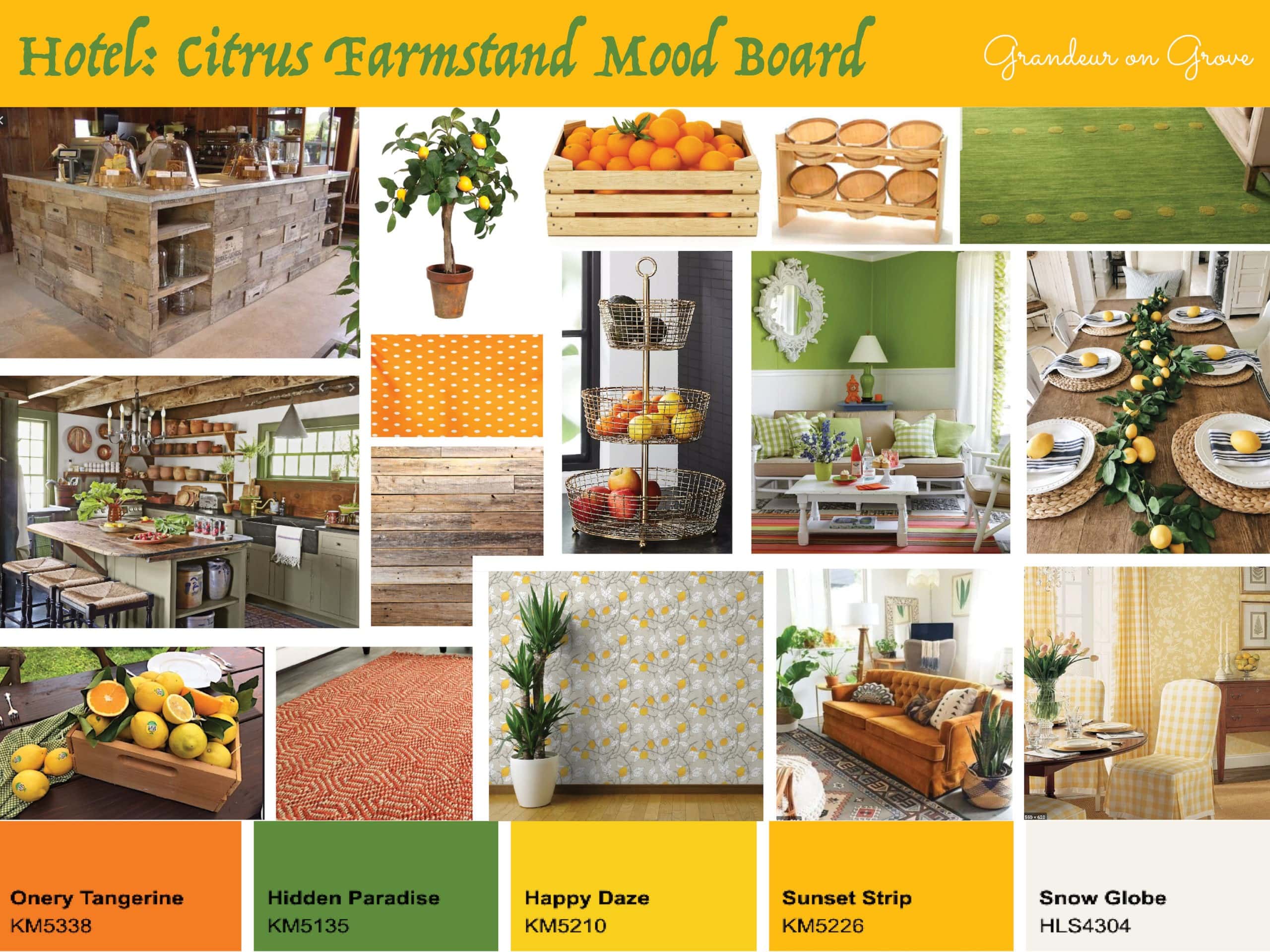 A mood board designed in a farmhouse style with a citrus, farmstand vibe for a Chicago hotel lobby design: