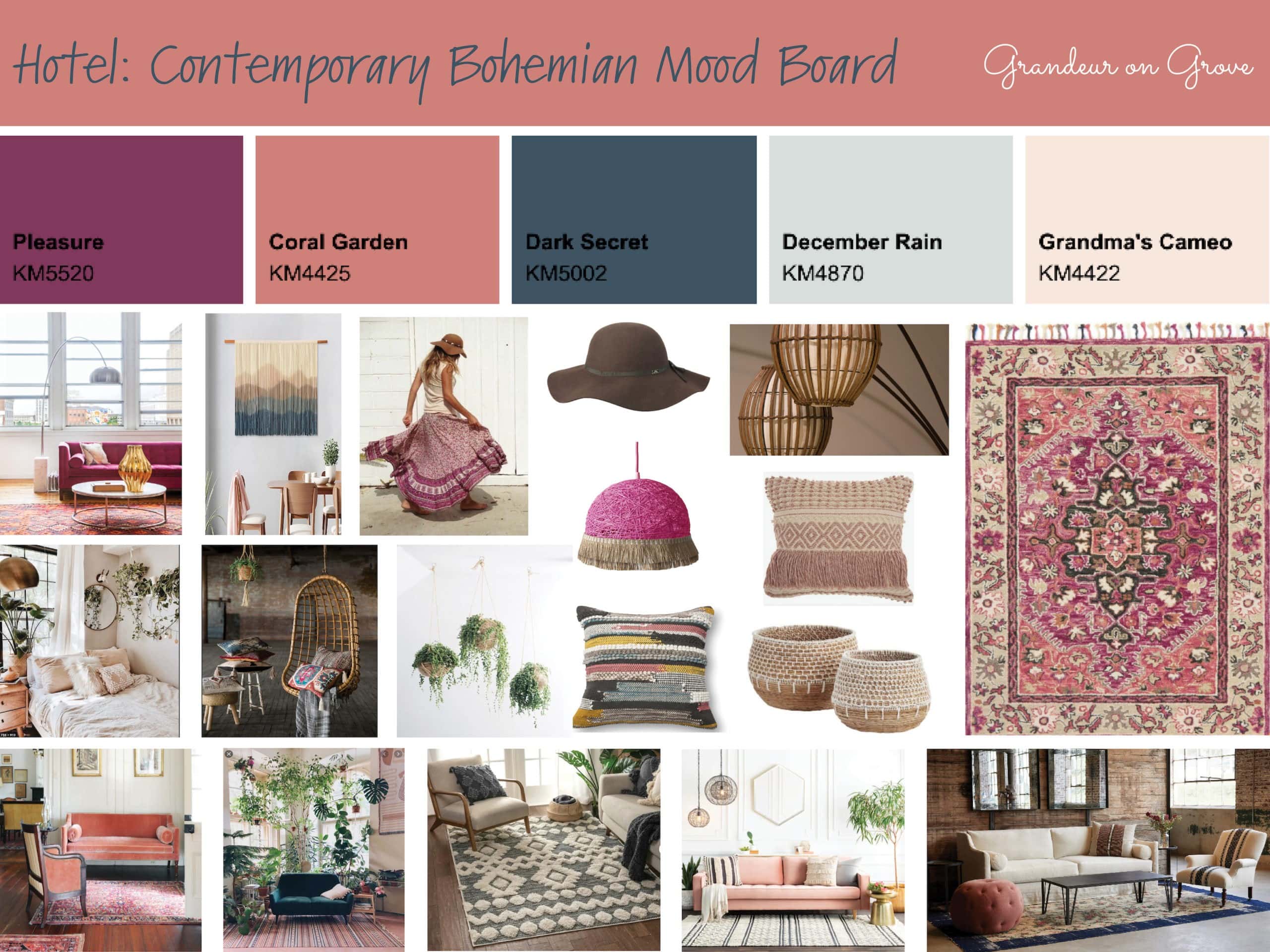 A mood board designed in a contemporary, bohemian style for a Chicago hotel lobby design: