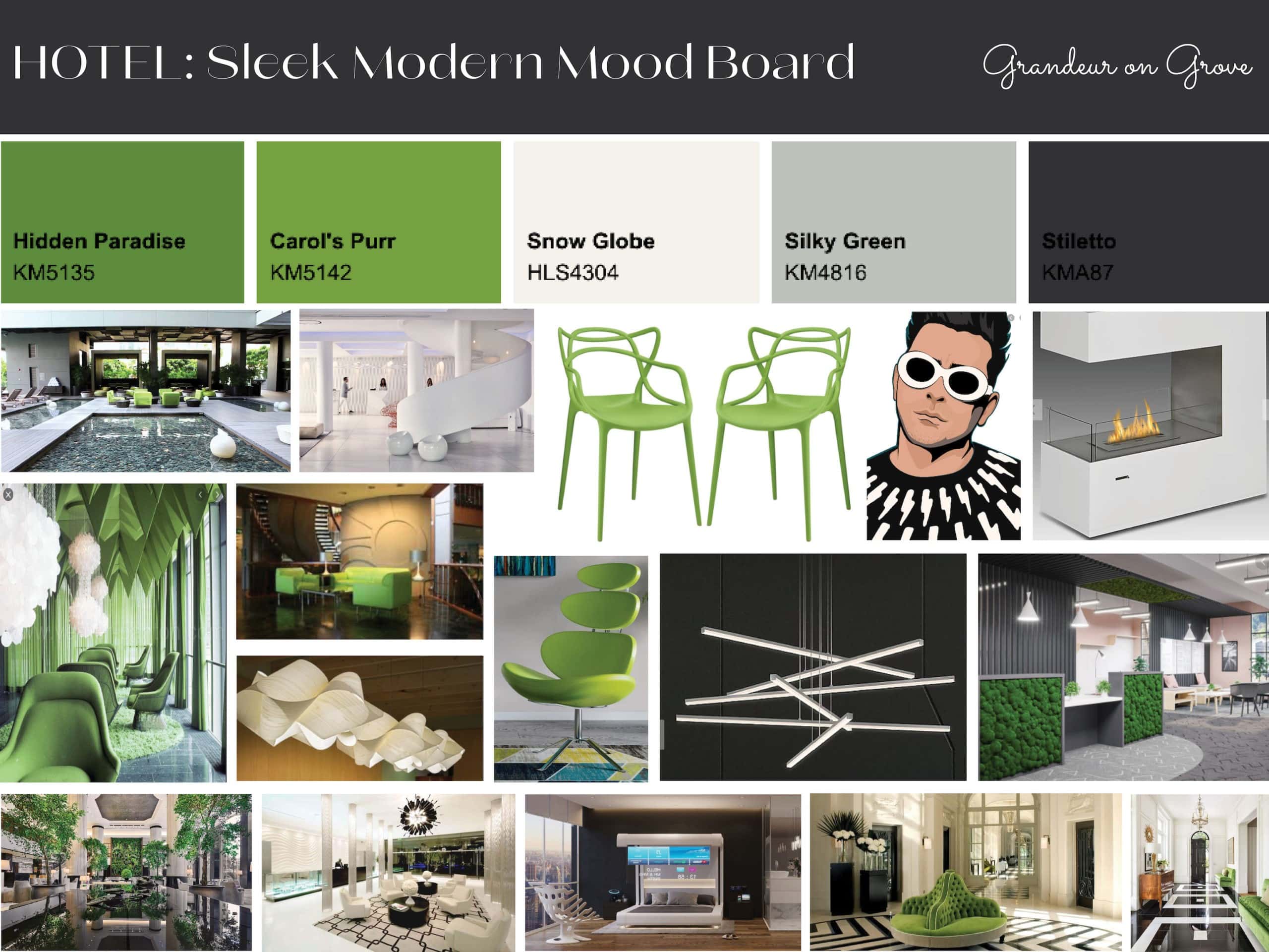 A mood board designed in a sleek, modern style for a Chicago hotel lobby design: