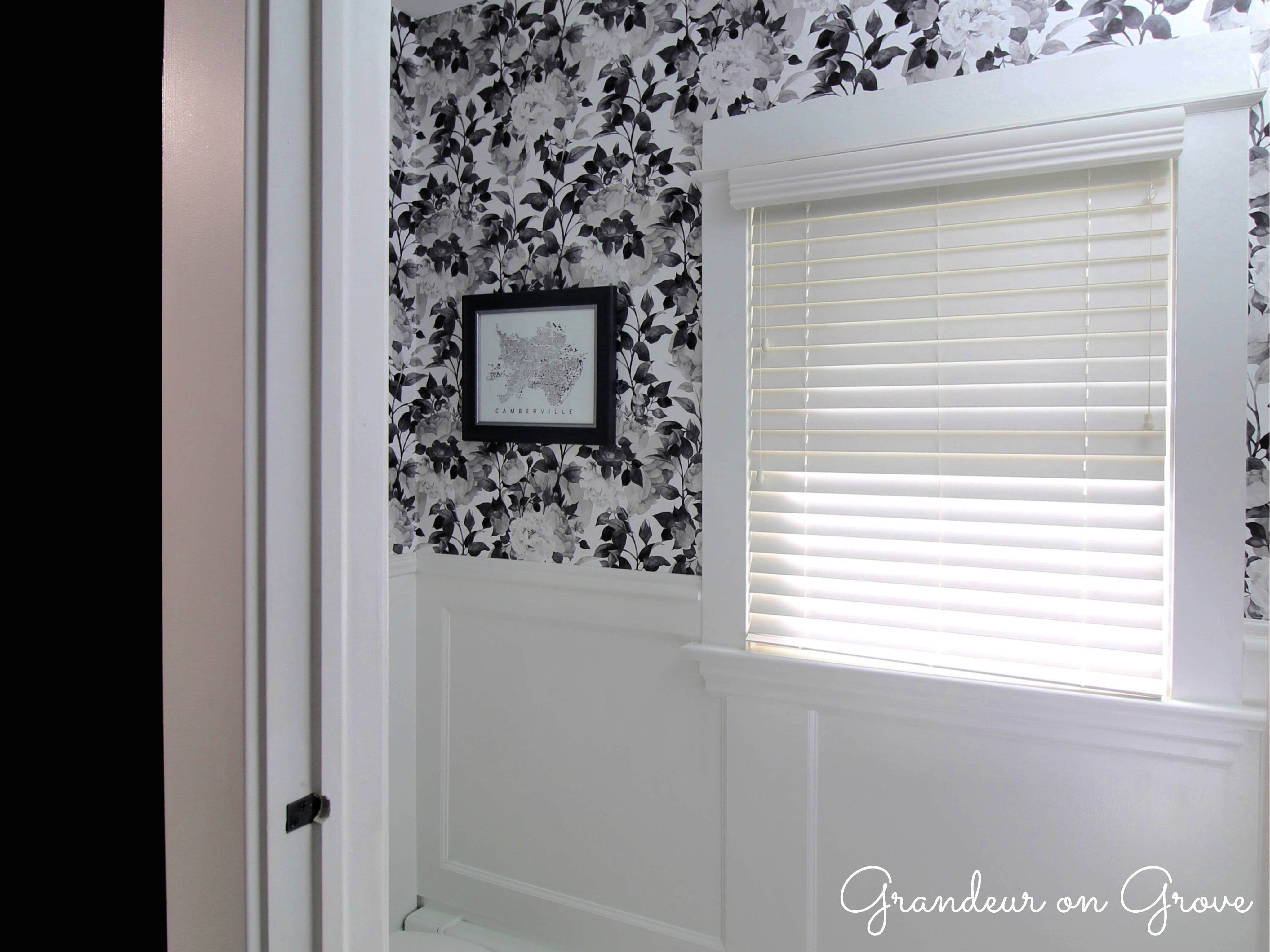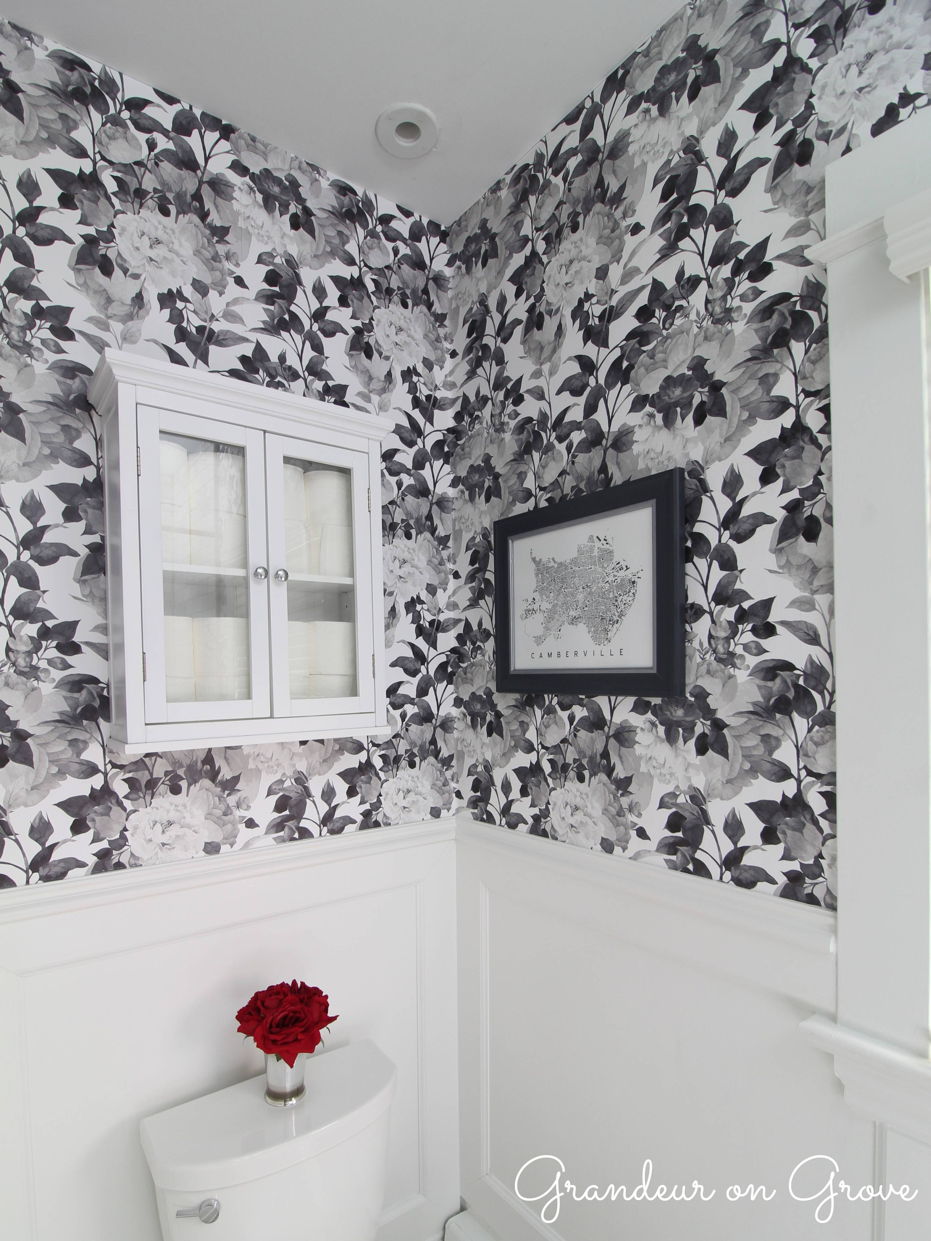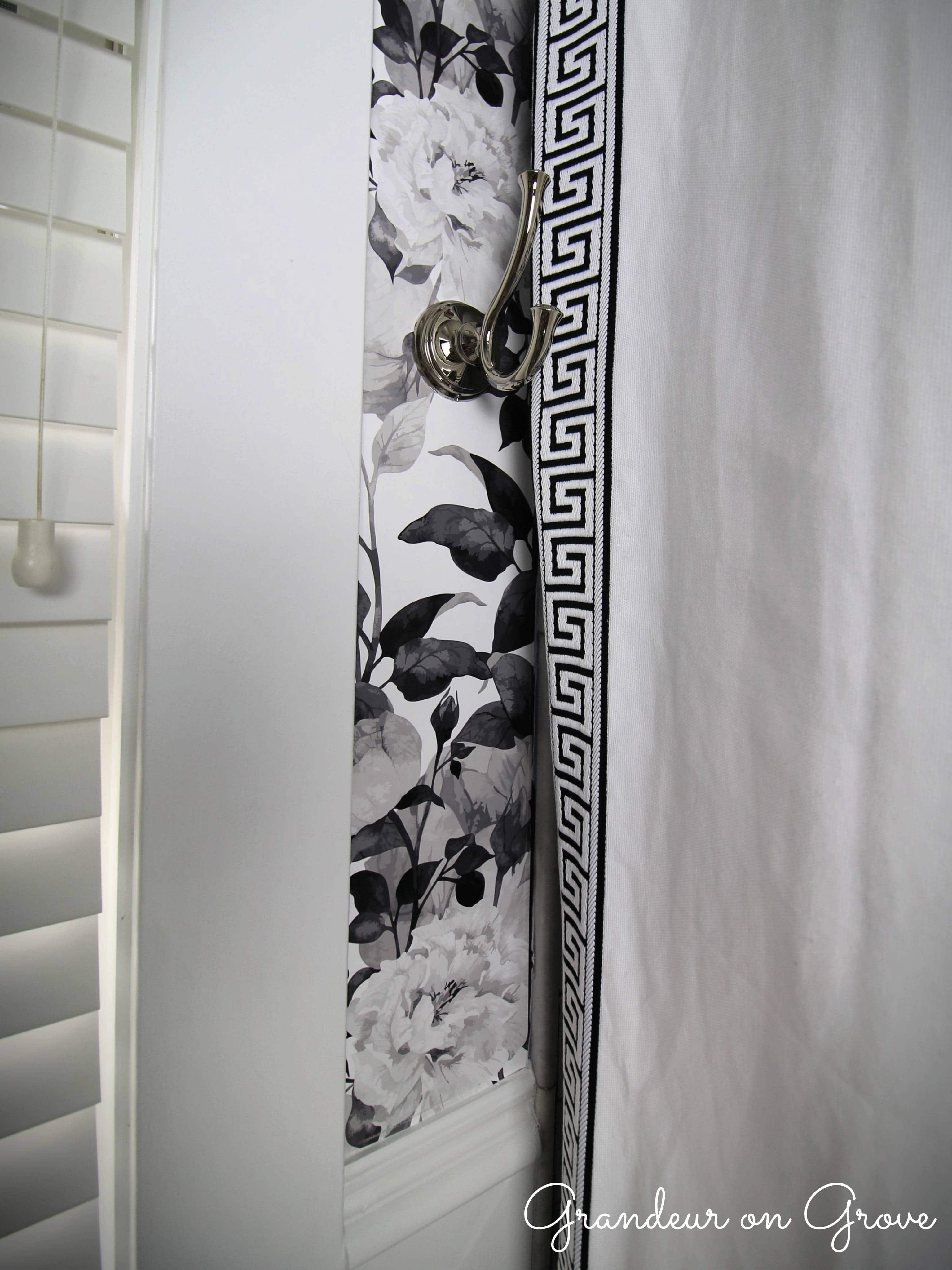 In the interior room, the Greek key element carries over to the shower curtain that I made by sewing decorative trim onto a white duck cloth curtain. I decided to contrast the geometric pattern with the dramatic impact of a large print floral wallpaper. To keep the floral design from overwhelming the small space, I had white wainscoting installed to the bottom half of the room. The wainscoting matched other wood trim throughout the house and provided a practical surface for cleaning the walls around the toilet.