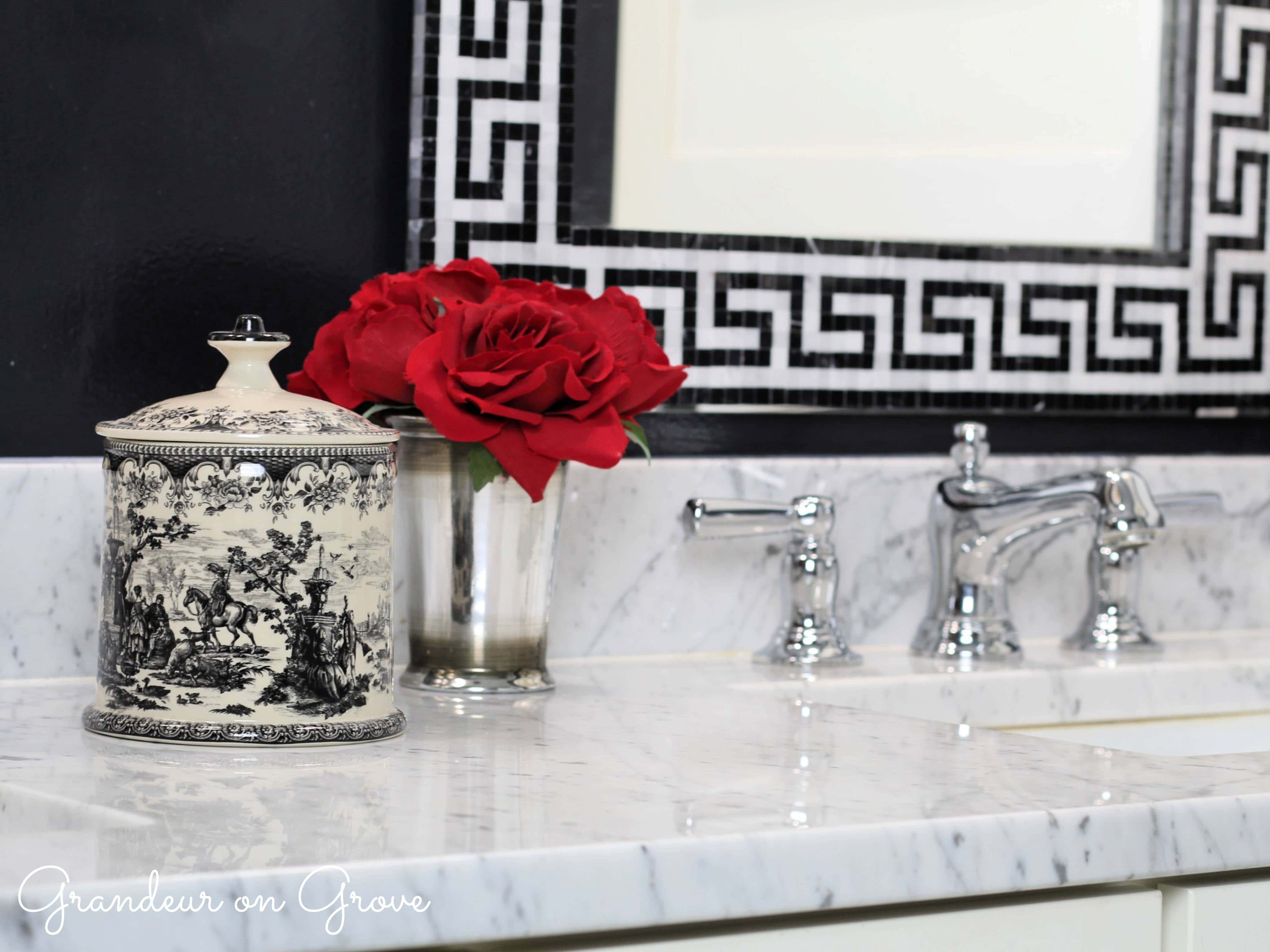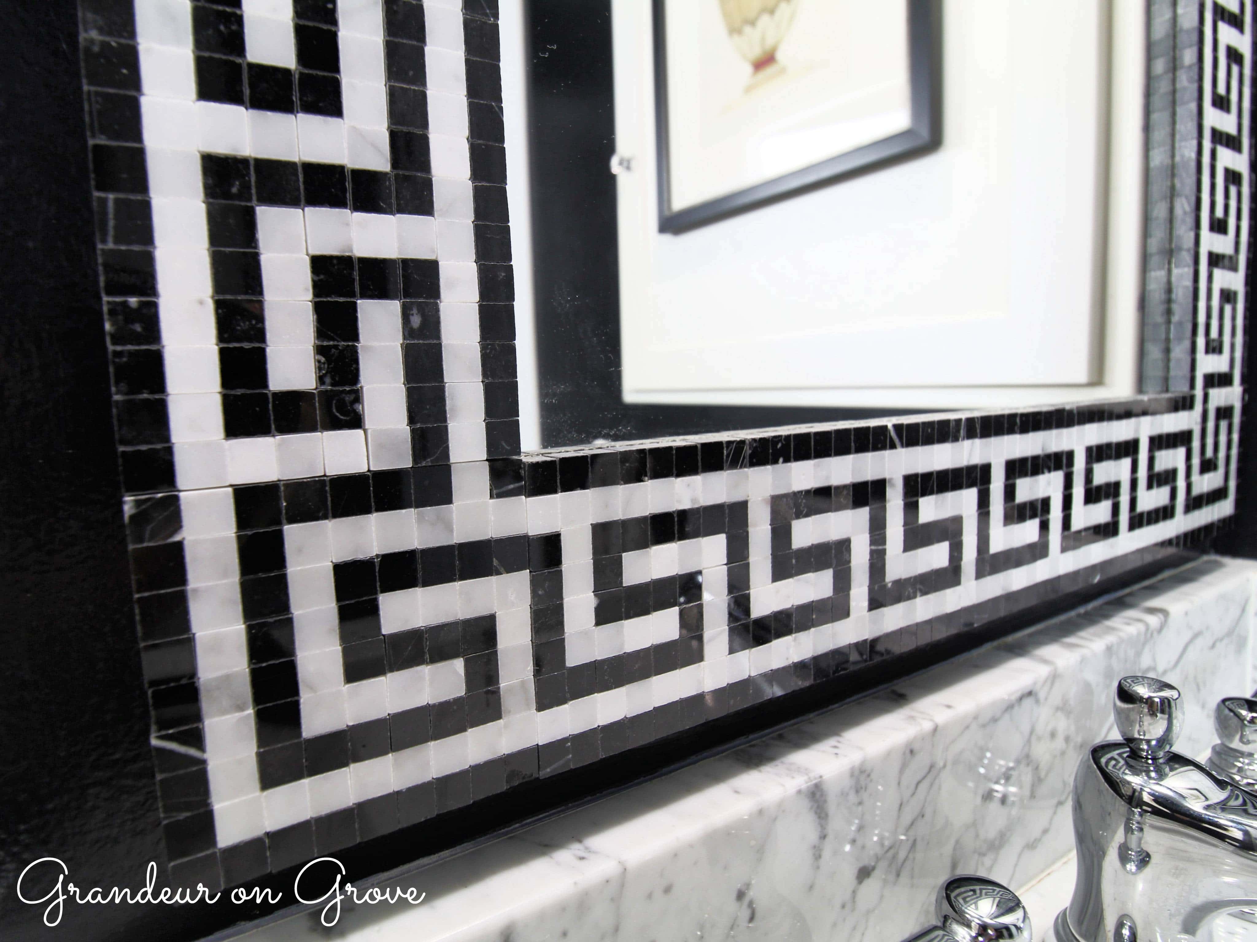 The exterior room houses the sinks and the interior has the toilet and bathtub. In the exterior sink room, I boldly applied black paint to the walls in a semi-gloss finish that created enough reflection to keep the room feeling bright. The black walls contrasted with the white trim for a sharp and classic look. I also installed a light bar for make-up application. I applied strips of Greek key design border tiles to the two existing wall mirrors using E600 glue. To complement the symmetry of the sinks and mirrors, I hung two urn prints. One print hangs on the left wall and the other on the medicine cabinet door, with the help of some 3M Velcro strips.