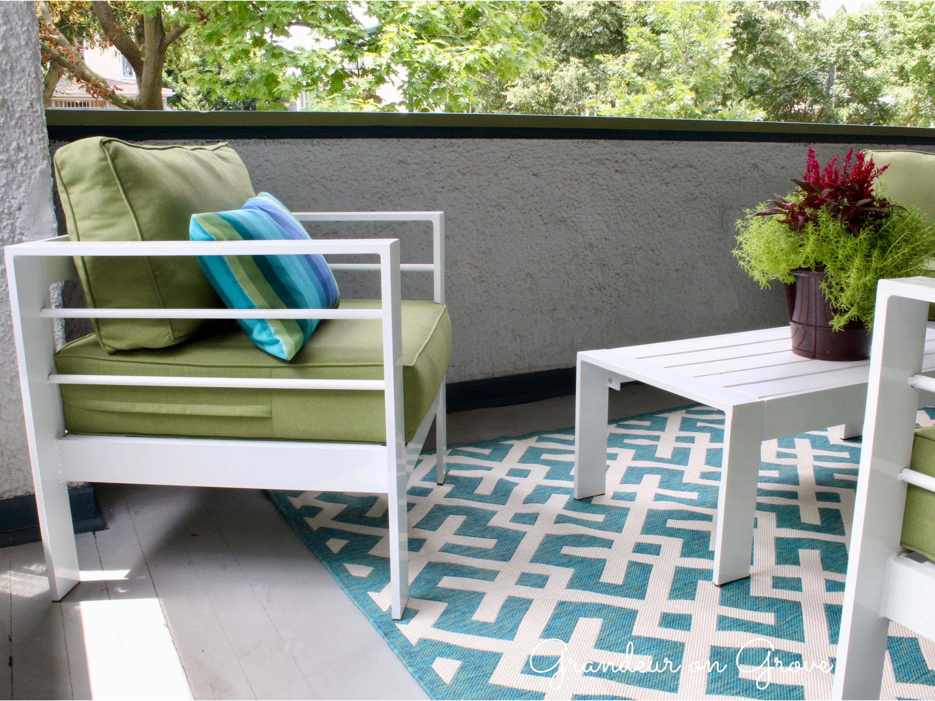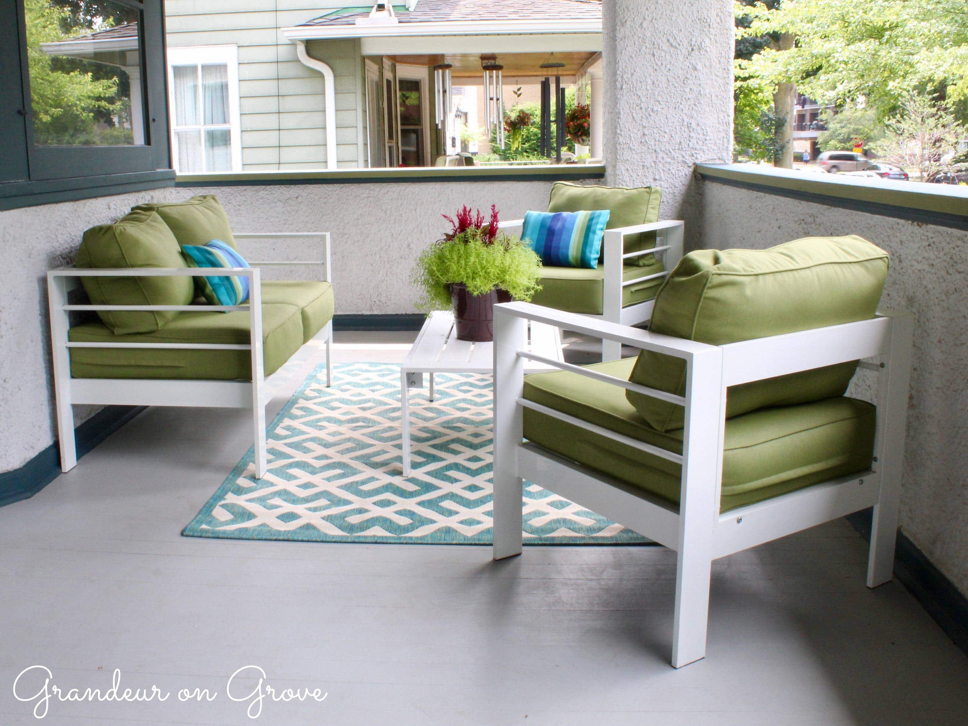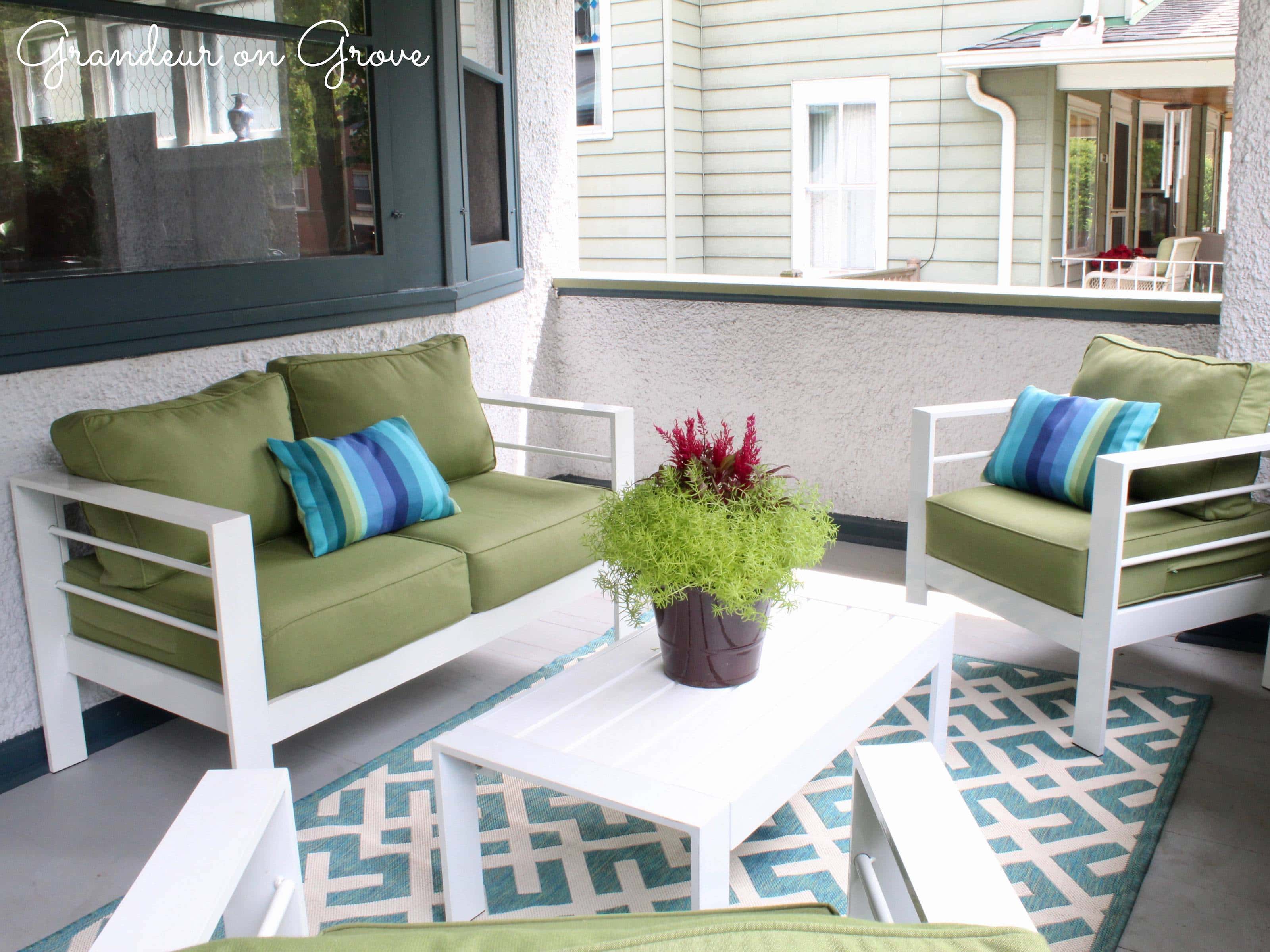When we chose colors for our exterior trim, we went bold with Benjamin Moore’s Amazon Green and Eucalyptus Green. To coordinate on the porch, I went with white, modern, geometric, metal outdoor furniture with lime green cushions. The addition of a geometric rug and striped pillows brought all the colors together to create a fun, welcoming atmosphere.