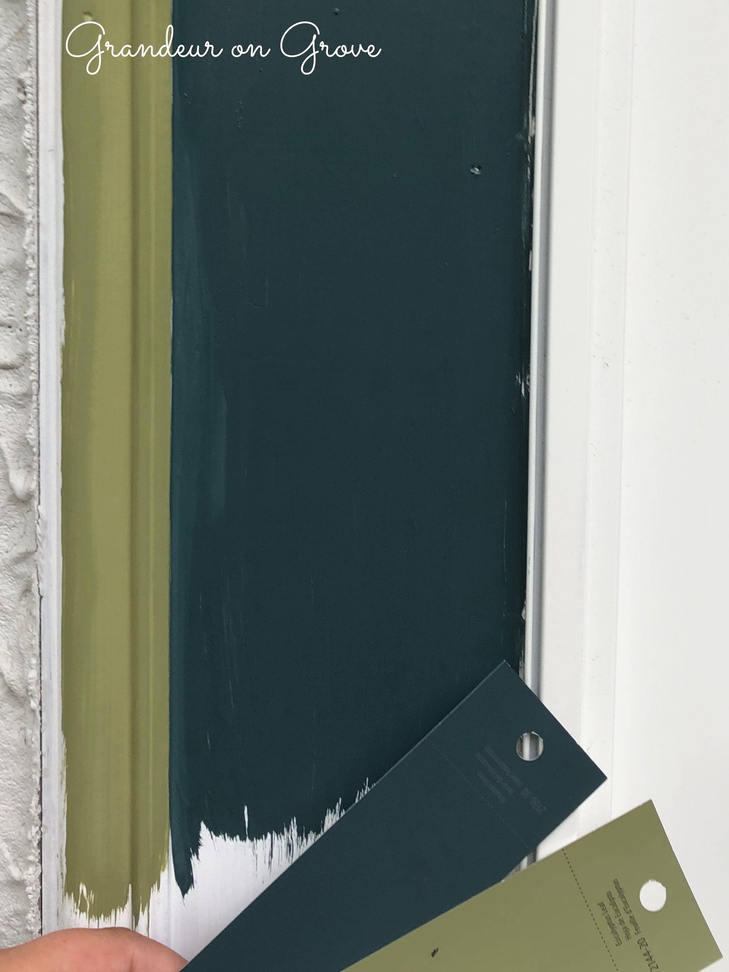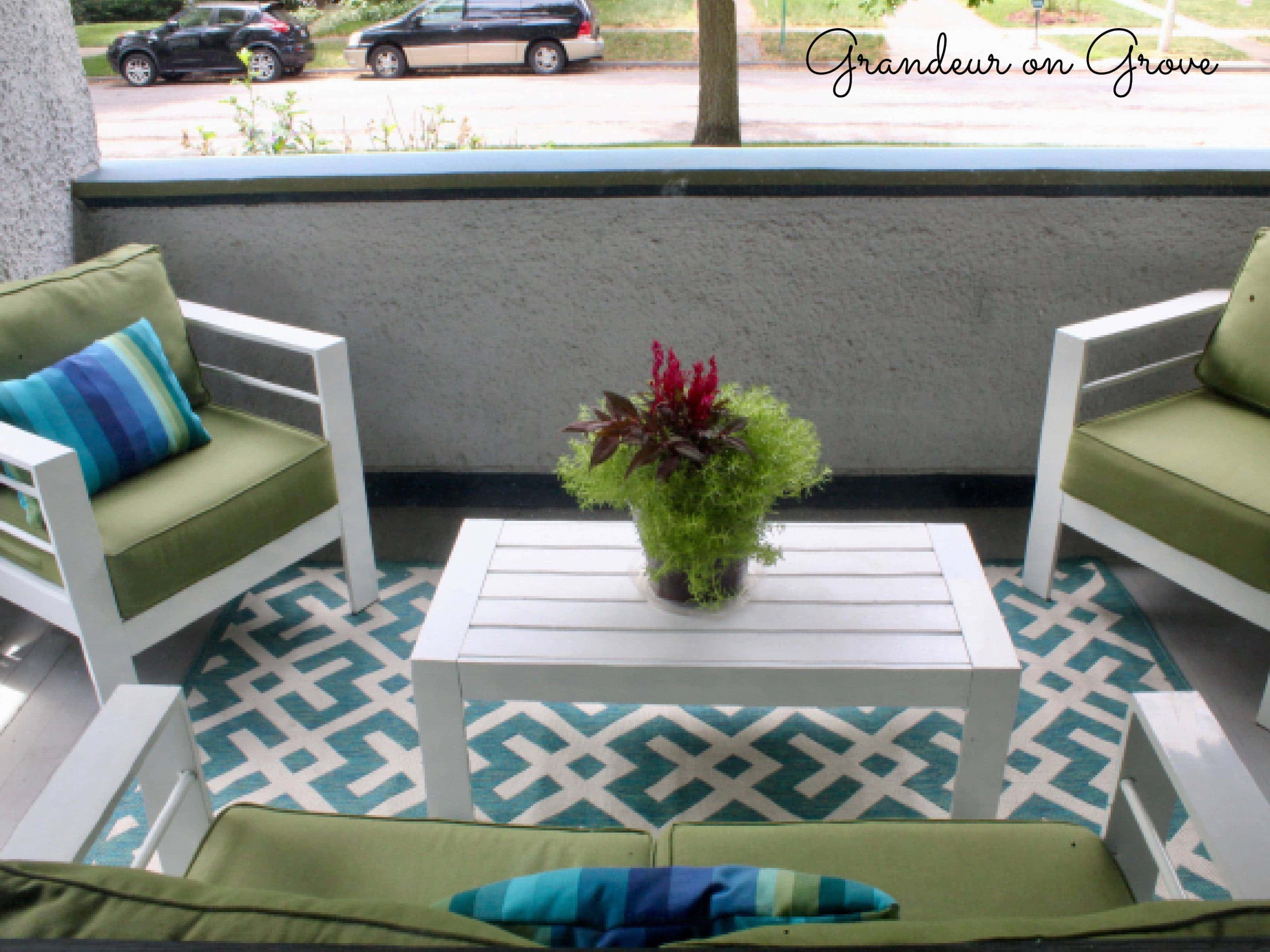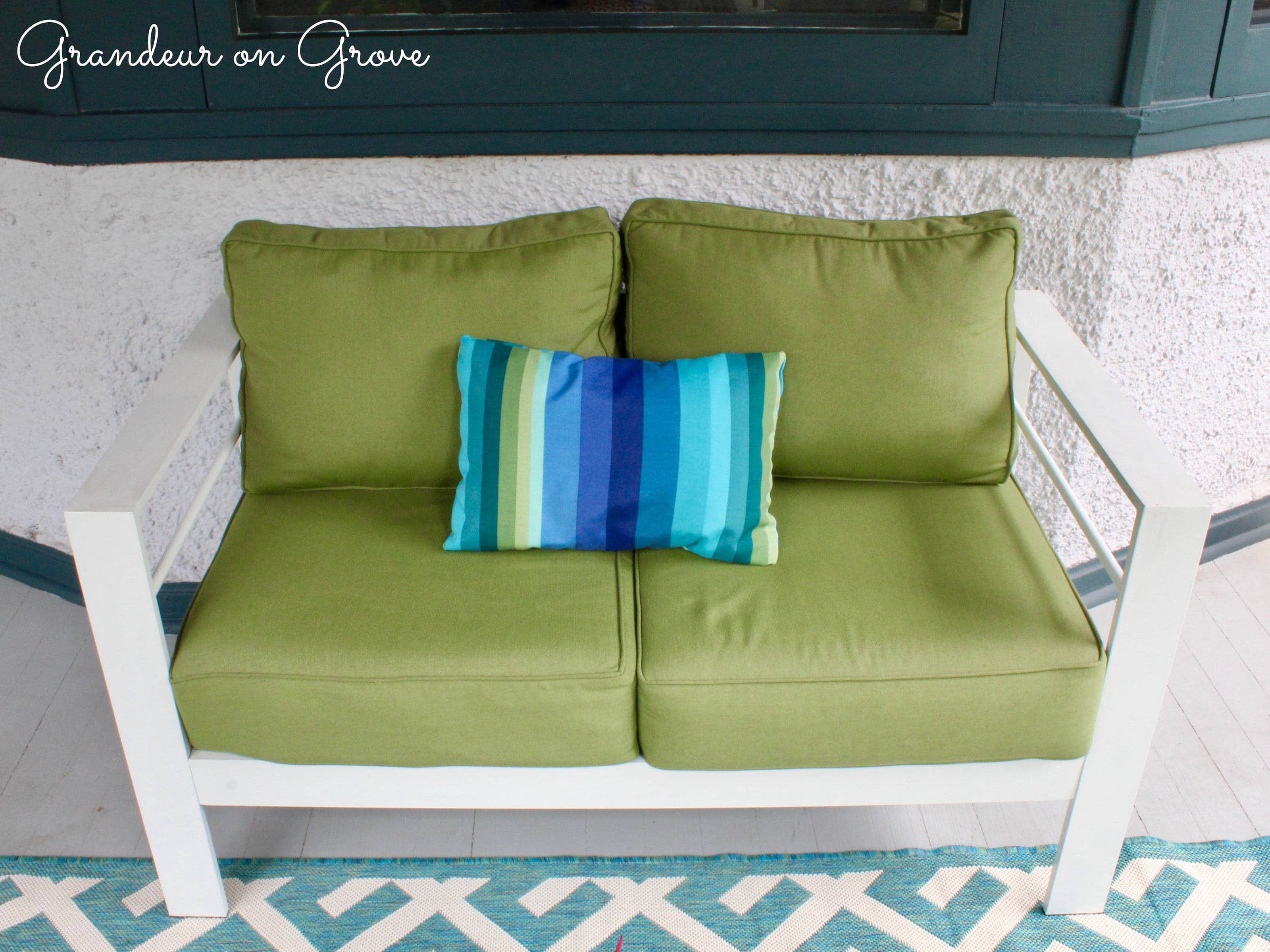 When we chose colors for our exterior trim, we went bold with Benjamin Moore’s Amazon Green and Eucalyptus Green. To coordinate on the porch, I went with white, modern, geometric, metal outdoor furniture with lime green cushions. The addition of a geometric rug and striped pillows brought all the colors together to create a fun, welcoming atmosphere.