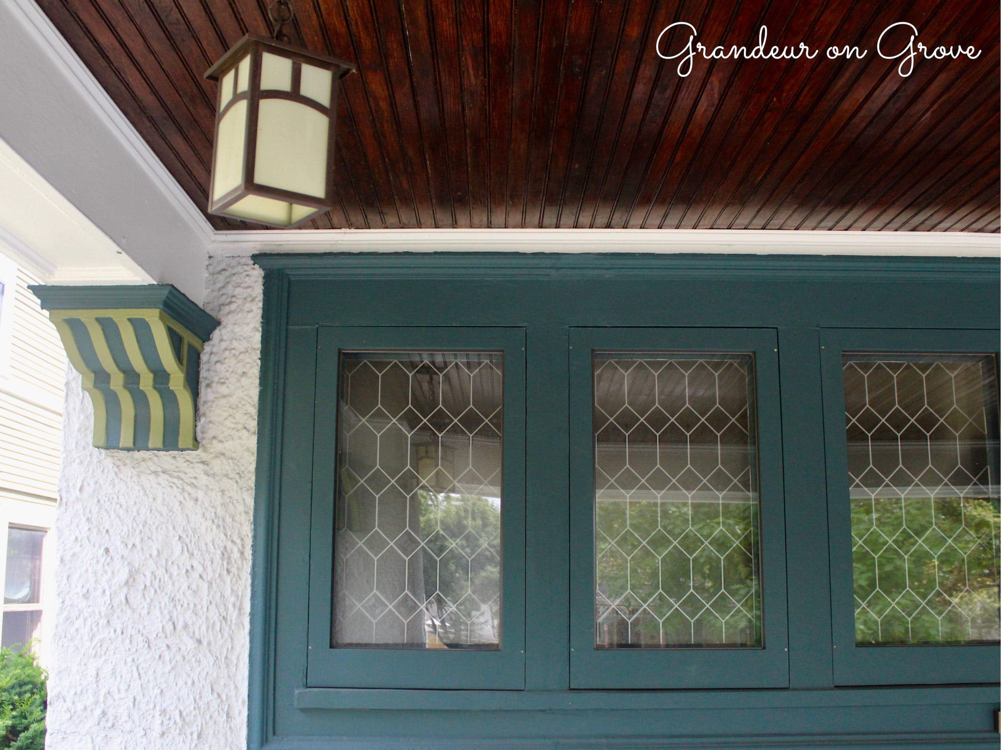 The sharp angles and geometric patterns harmonize with the rectangular shape of our porch’s openings and honor the craftsman-style era of the house. Rectangles also appear in the tall windows and in the lines of the copper Craftsman-style lights. As final contemporary touches, the pendants, mailbox, and house numbers accents are also copper.