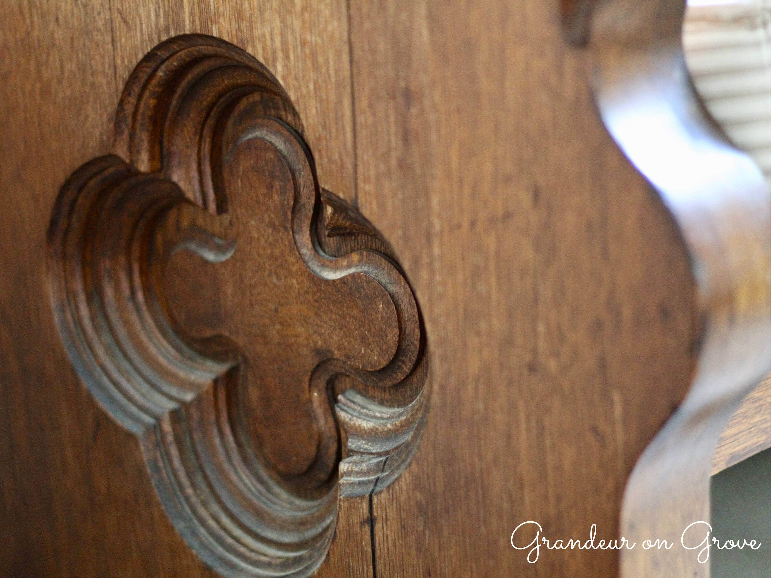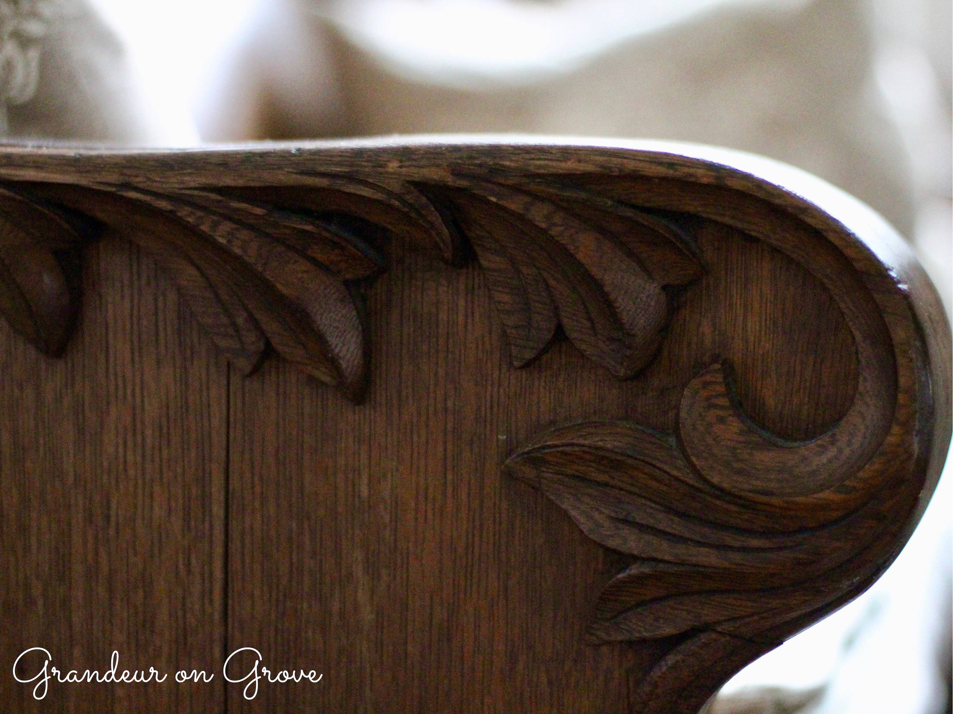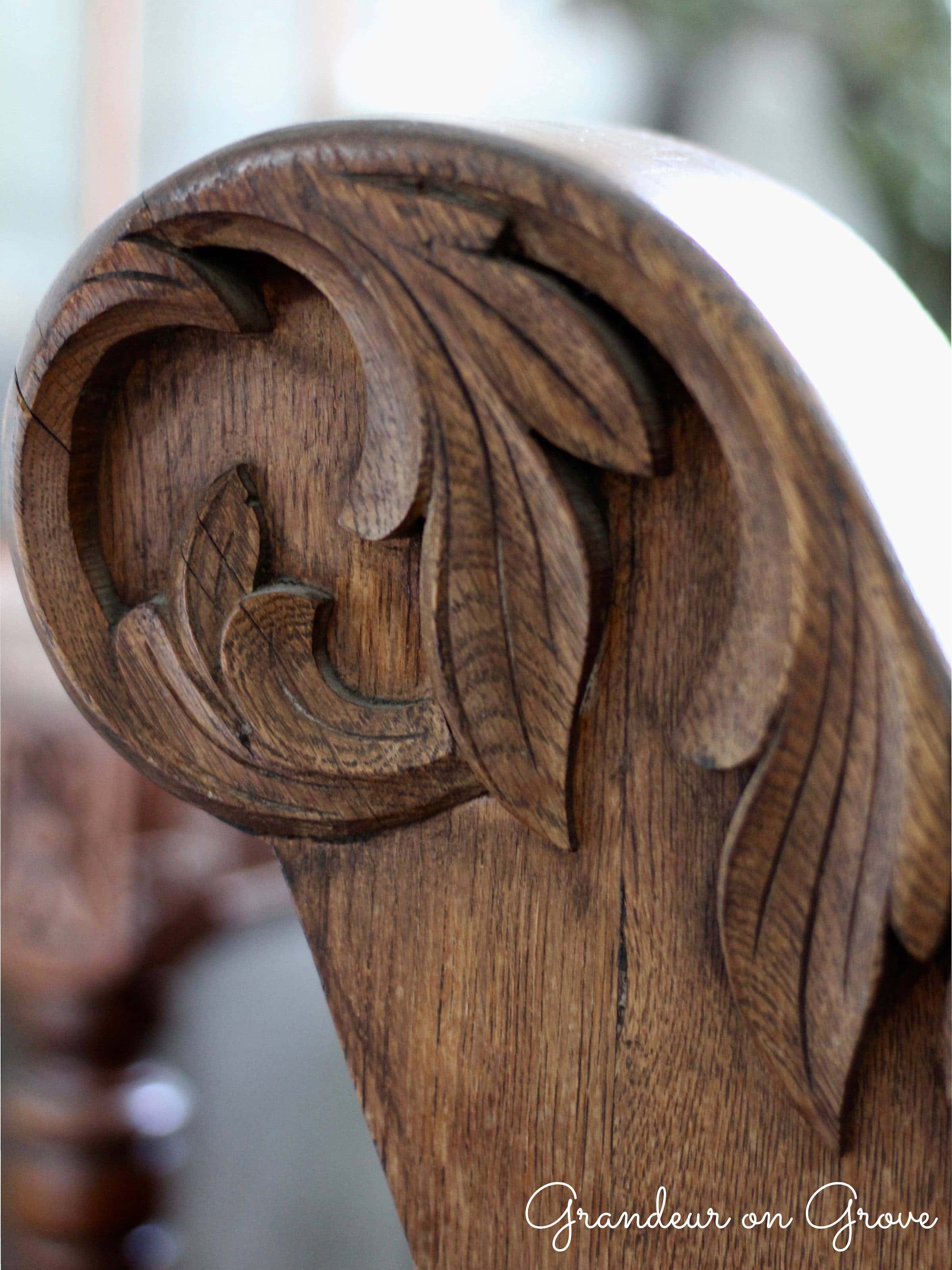 To furnish the breakfast nook, I found a beautiful antique church pew. I placed a sofa table behind the bench to add space for plants and decorations. The sofa table pushed the pew out from the wall to make the wood carvings visible on the side. I used a taupe colored French ticking fabric for both the French tufted pew cushion and the faux roman shade window treatment above the sink. A medium-sized Duncan Phyfe style table fits the space, and I’ve paired it with a contemporary acrylic-legged velvet-tufted bench. I love this bench because it adds a surprise texture to the area, and it does double duty as both breakfast nook seating and a place to put on shoes before heading out the door. The clear legs create more visual space, allowing the beautiful legs of the table to remain visible. It’s a great example of how I’ve paired contemporary pieces with antiques.