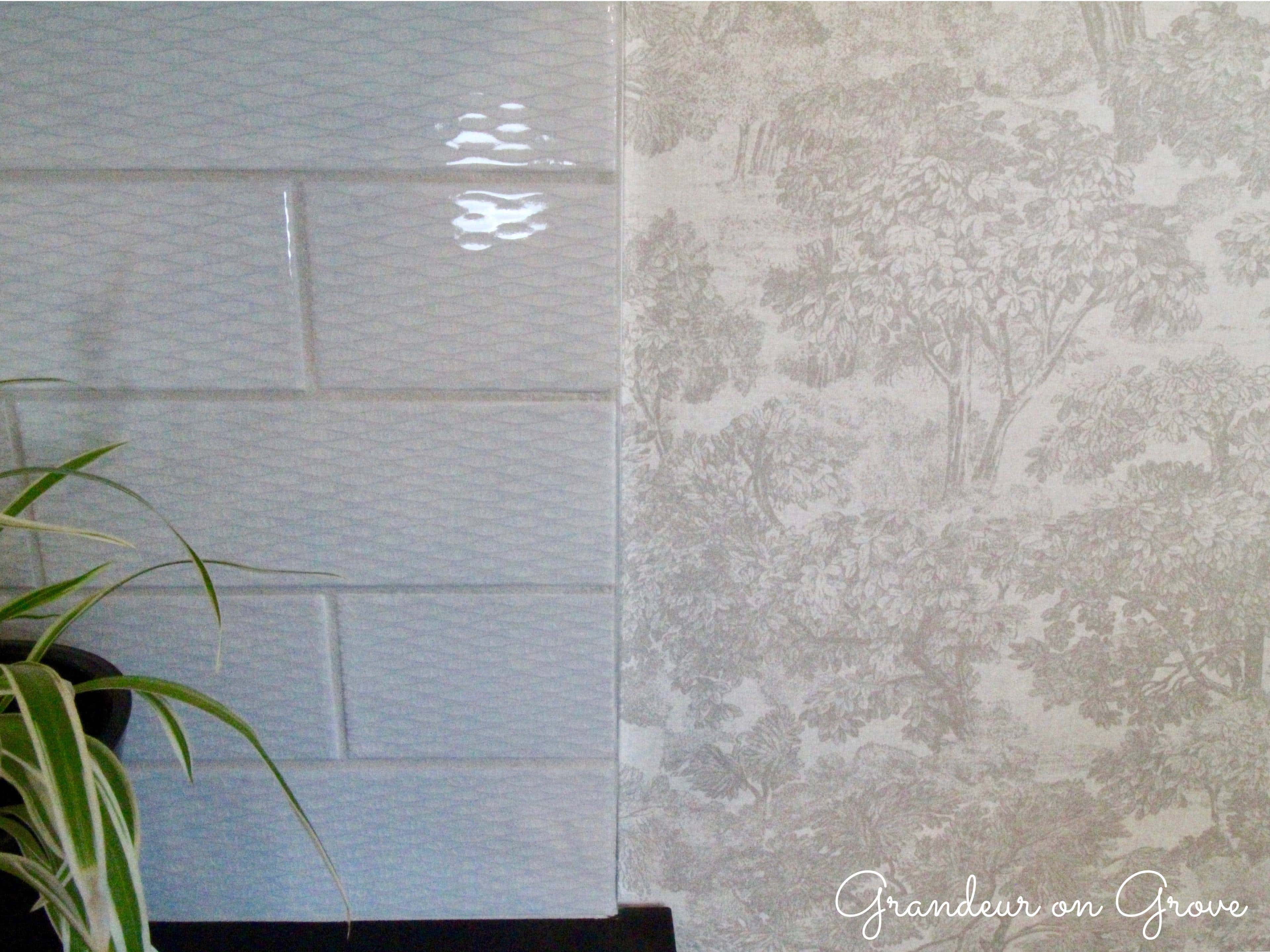One new item that coordinated seamlessly with the existing wall color was a taupe toile tree wallpaper, Brewster’s Walllcovering’s Blyth. I’d had my eye on for the pattern for a long time, and I decided to install the wallpaper on two accent walls in the breakfast nook. I carried the tree theme over to the nook’s flush mount branching chandelier and the subtle leaf-like pattern of the backsplash subway tiles in Emser’s Motif White Lace.