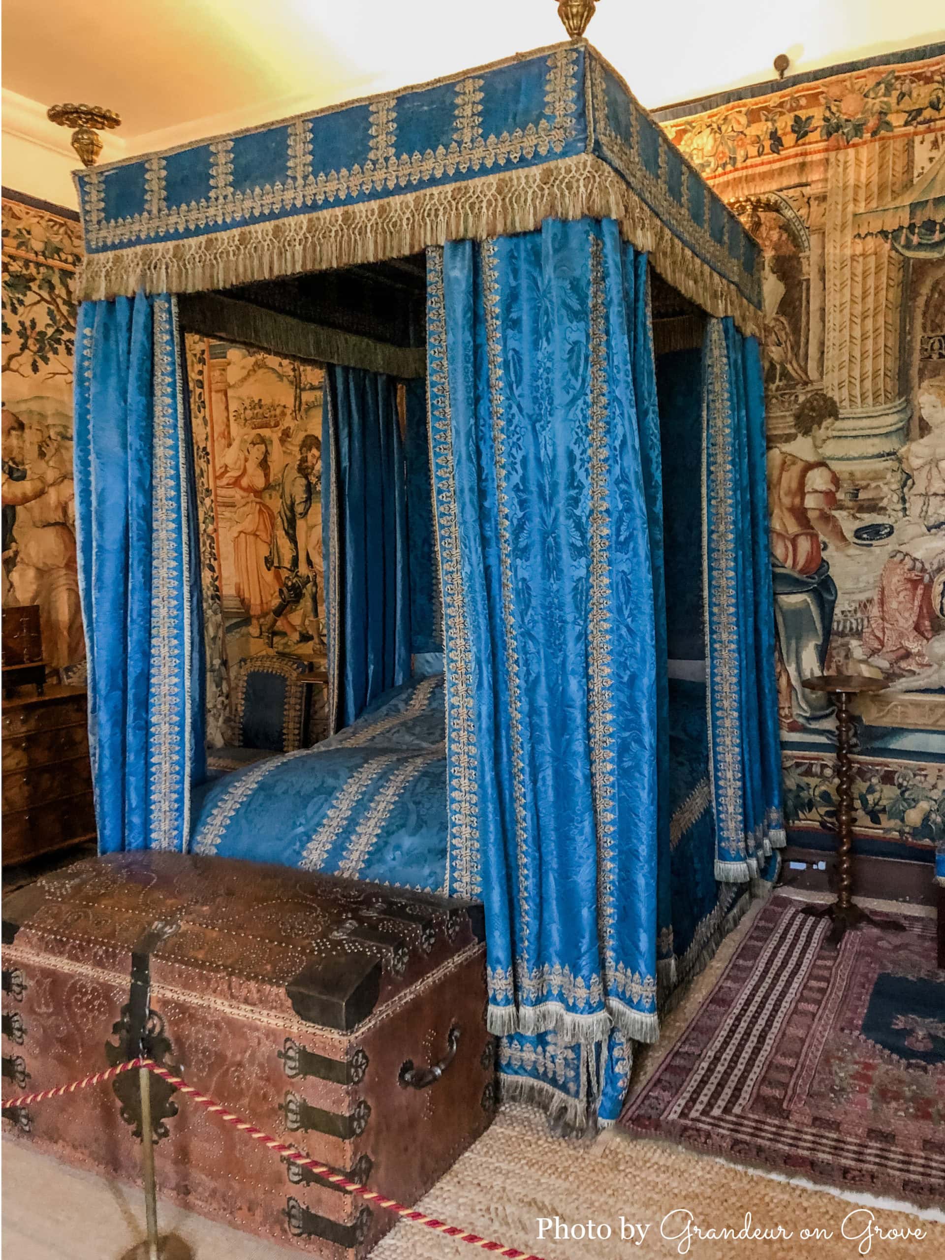 This blue-curtained bed is made of a glossy silk damask print with coordinating fibrous fringe and embroidery.