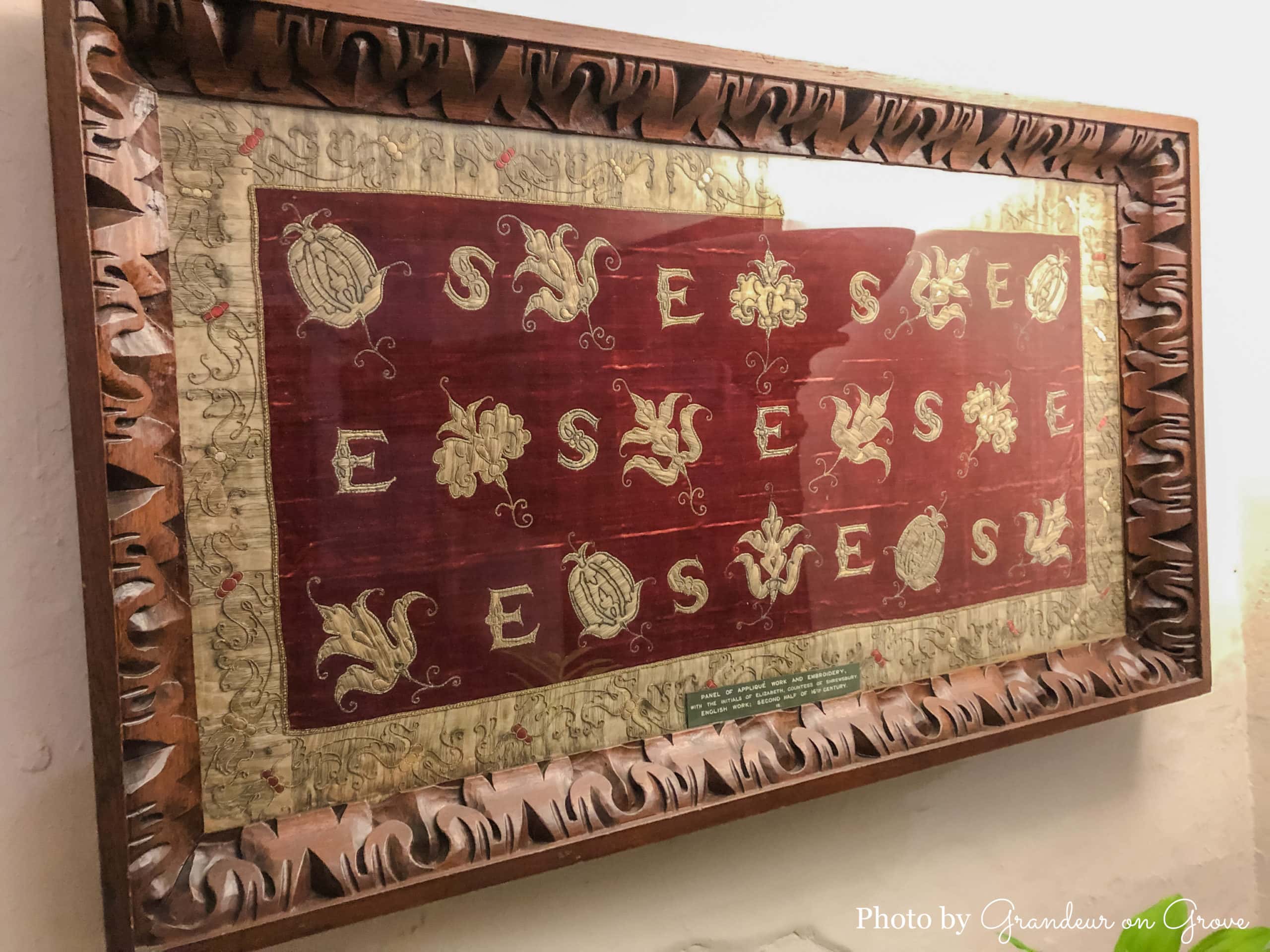 This hand-sewn embroidery piece by Elizabeth of Shrewsbury–hence the E’s and S’s–uses faded, gold-threaded and silk applique on a red velvet background with a silk embroidered border.